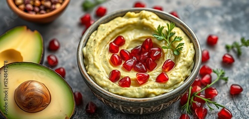 Creamy avocado dip, vibrant pomegranate seeds & fresh herbs Healthy, anti-inflammatory superfood snack, snack, plant-based