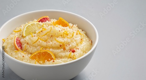 Creamy citrus dessert with orange and lemon slices in white bowl