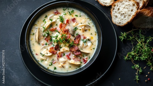 Creamy Clam Chowder with Bacon, Bread, Thyme