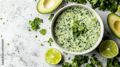 Creamy green soup, avocado, lime, cilantro on textured surface