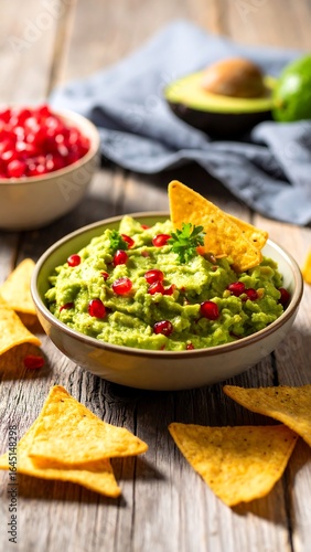 Creamy guacamole with pomegranate seeds and tortilla chips