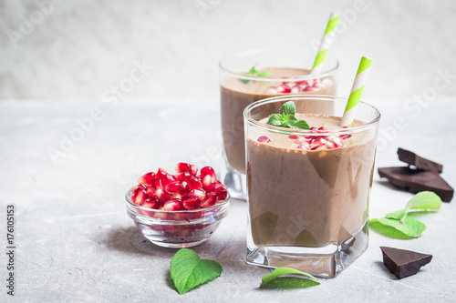 Creamy hot chocolate pea nut butter pomegranate smoothie. Selective focus, space for text.