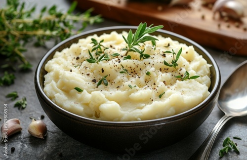 Creamy mashed potatoes with fresh herbs, served with a silver spoon