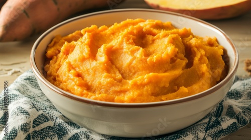 Creamy mashed sweet potatoes are presented in a rustic bowl, garnished with fresh herbs, highlighting vibrant colors and textures, perfect for a comforting side dish at any meal