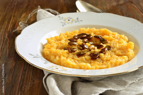 Creamy pumpkin risotto with caramelized pumpkin seeds