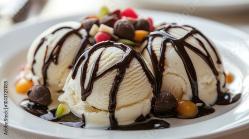 Creamy vanilla ice cream scoops drizzled with chocolate sauce and adorned with a variety of toppings