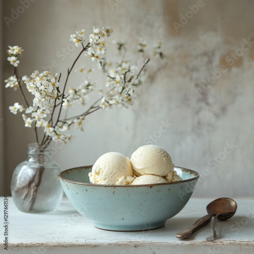 Creamy vanilla ice cream scoops in rustic blue bowl with delicate white flowers in a glass vase on wooden table background for a refreshing dessert scene