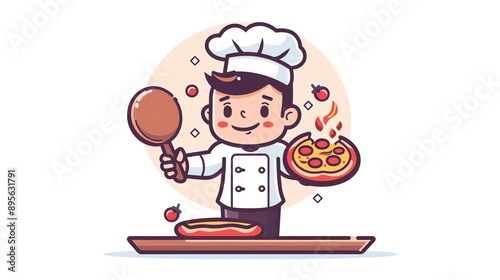 Create a clipart of a Chef holding a platter with a gourmet dishin a kawaii style, simplified to feature fewer elements for a cleaner look, Use a color palette that is appealing to children, wi
