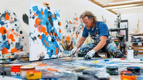 Creative artist works on a vibrant abstract painting in a lively studio. The image captures the dynamic energy and colorful expression of the artistic process.