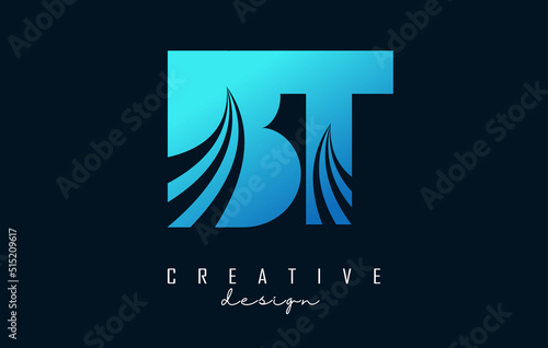 Creative blue letters BT b t logo with leading lines and road concept design. Letters with geometric design.