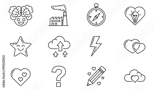 Creative Business and Technology Line Icon Set Featuring Brain, Factory, Compass, Idea Heart, Cloud Upload, Lightning Bolt and Pencil Symbols in Outline Style