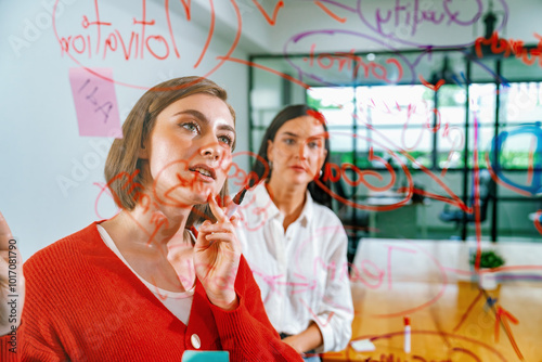 Creative business team brainstorming and sharing marketing idea about start up project by writing down on colorful sticky note at glass board modern meeting room. Working together. Immaculate.