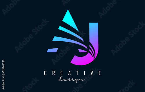 Creative colorful letters AJ A J logo with leading lines and road concept design. Letters with geometric design.