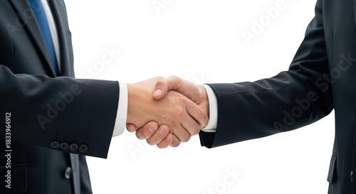 Creative composition of corporate handshake between two businessmen in formal suits focused on handshake, business, agreement