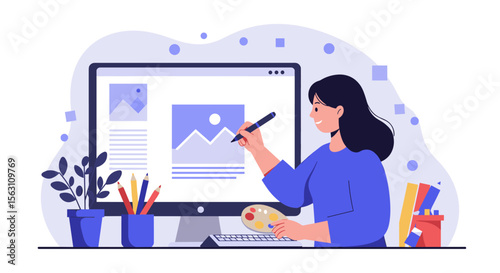 design, digital, art, computer, woman, creative, web, graphic, screen, drawing, flat, colours, plant, palette, modern, workplace, technology, workspace, project, office, tool, illustration, layout, development, innovation, concept, creativity, professional, style, composition, planning, visual, artistic