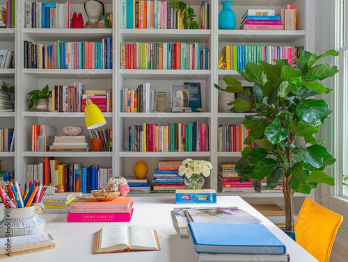 Creative Flare: White Study Table with Colorful Book Highlights