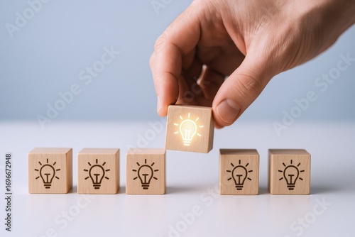 Creative idea concept: Hand places a wooden block with light bulb icon atop a row.