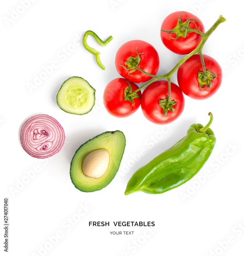 Creative layout made of tomato, onion, green pepper, cucumber and avocado. Flat lay. Food concept. Vegetables isolated on white background.