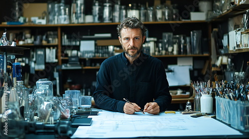 Creative professional working meticulously at a cluttered desk surrounded by art supplies, showcasing passion and dedication in a warm, inviting studio environment