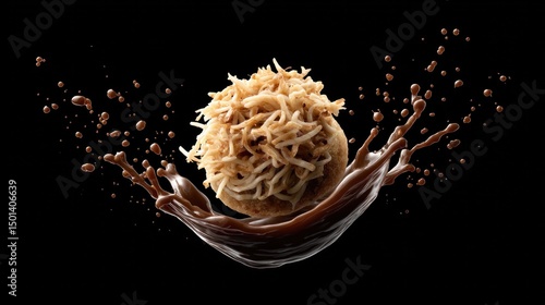 Creative ramen burger explosion with flying noodles and splashes of sauce, perfect for innovative food concepts and dynamic design