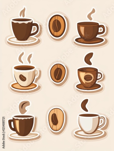 Creative style stickers featuring colorful coffee cups and coffee beans for fun designs. Generative AI