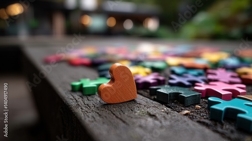 Creative wooden heart and colorful puzzle pieces on outdoor bench