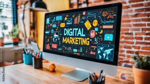 Creative workspace featuring digital marketing tools on a computer screen with colorful office decor