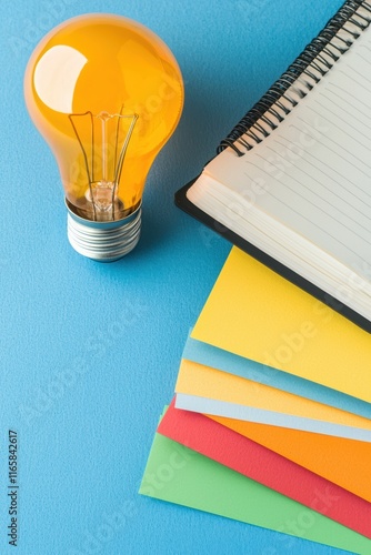 Creative Workspace with Colorful Paper, Light Bulb, and Notebook on Blue Background