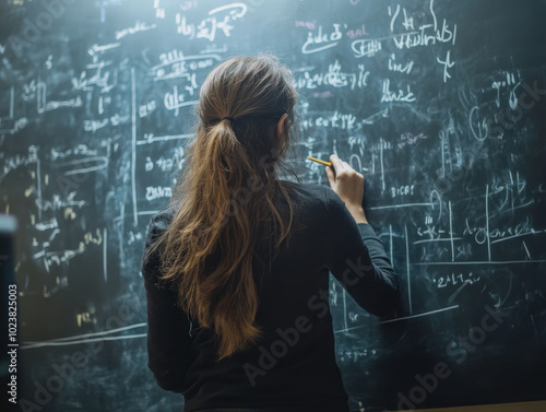 Creative young woman engaged in mathematical problem-solving in a classroom setting