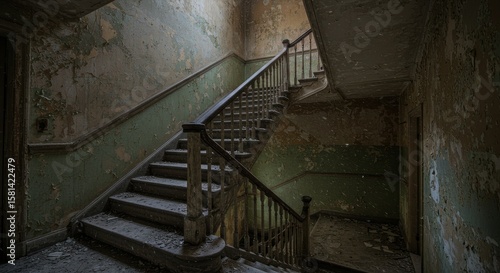 Creepy abandoned staircase in a derelict building