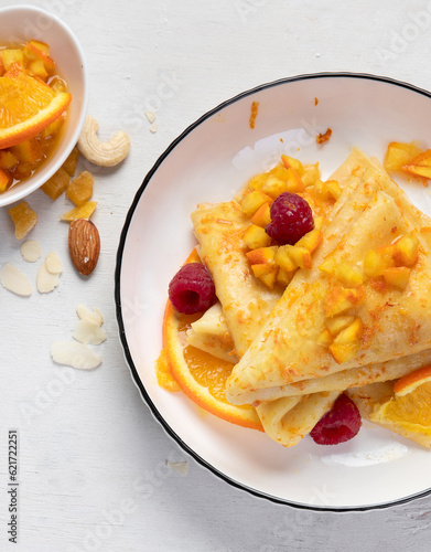 Crepe suzette with orange sauce and raspberry for a delicious breakfast.