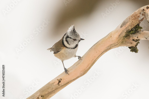 Crested tit, Parus cristatus, single bird on branch in snowy woodland, Slovenia, Europe
