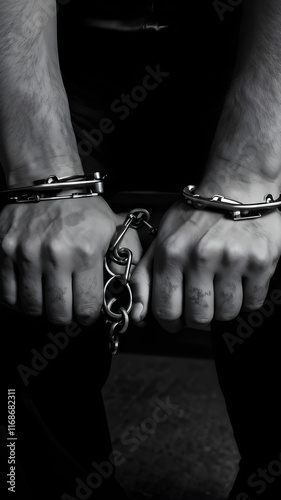 Criminal hands in handcuffs in Jail Crime Arrest Incarceration Punishment Justice Prison Law Enforcment monochrome color