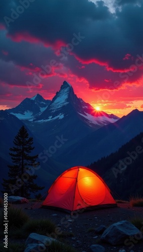 Crimson sunset fire, illuminates lone mountain tent , equipment, fire, travel
