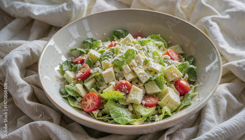 Crisp Caesar salad in cream-colored bowl with linen textures under studio glow.