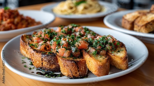 Crisp toasted bread topped with fresh mozzarella, ripe tomatoes, basil, and olive oil showcases a delightful Italian dish