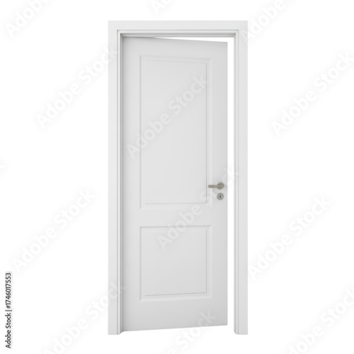 Crisp white door ajar inviting passage presented on a clean transparent visual field
