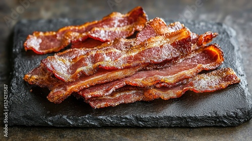 Crispy bacon strips stacked on dark slate, breakfast deliciousness