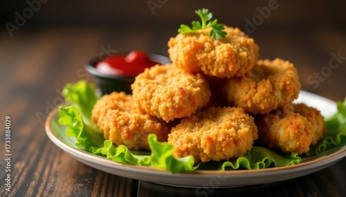 Crispy breaded chicken nuggets, lettuce, ketchup , chicken nuggets, food, culinary