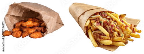 Crispy chicken nuggets and loaded french fries wrapped in brown paper, vibrant textures, appetizing presentation, casual fastfood style, mouthwatering comfort food isolated transparent png