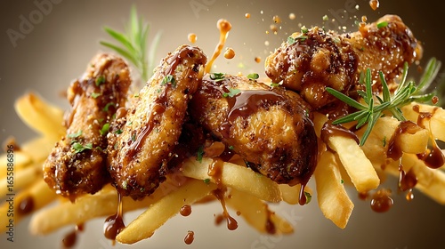 Crispy Chicken Wings and Golden Fries Flying with Barbecue Sauce Burst, Cheese Drips, and Herbs on Soft Beige Background
