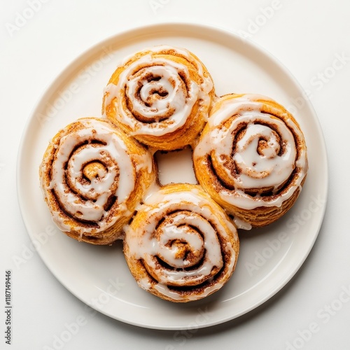 Crispy cinnamon rolls with glaze, displayed on a white plate, on pure white background with copy space