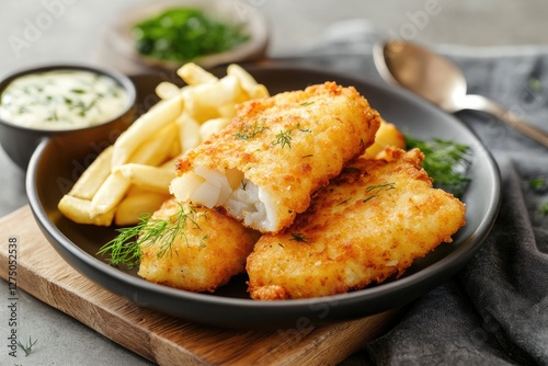 Crispy Fried Fish Filets Served With Fries And Sauce