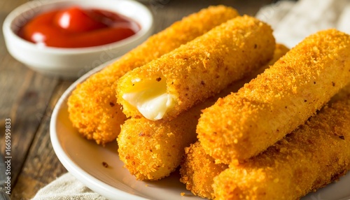 Crispy fried mozzarella sticks with creamy cheese pull and dipping sauce for restaurant menus and social media
