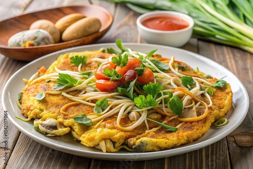 Crispy fried mussels omelette with bean sprout and spicy sauce