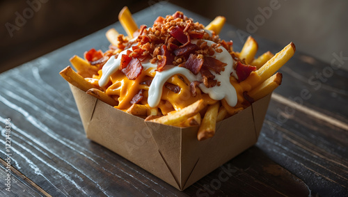 Crispy fries topped with cheese and bacon served in a rustic bowl