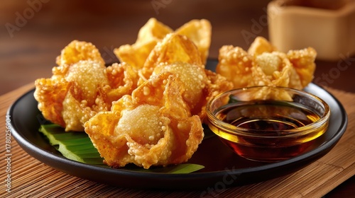 Crispy Golden Fried Dumplings Served with Dipping Sauce on a Rustic Wooden Table