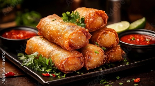 Crispy golden fried spring rolls with fresh herbs, Deep