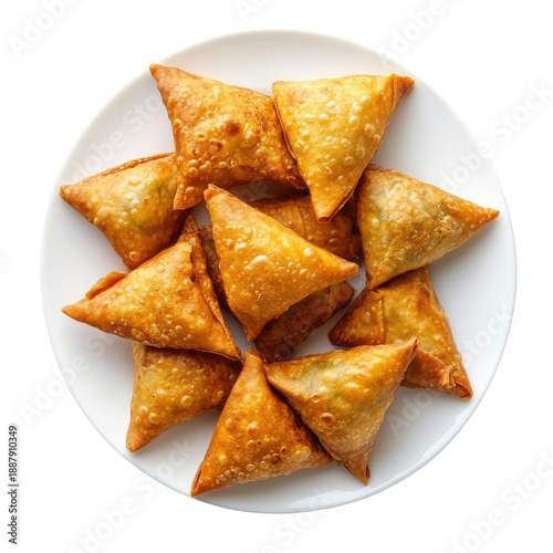 Crispy golden samosas on white plate isolated on transparent background
