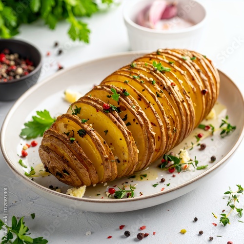Crispy hasselback potatoes elegantly presented against a pristine white backdrop